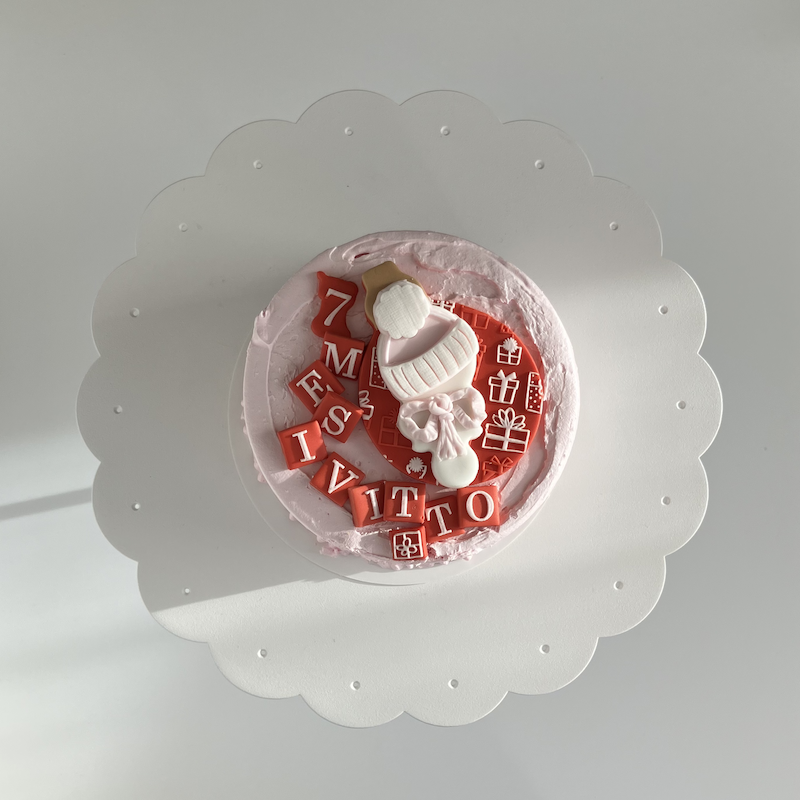 Allegra e giocosa la torta pensata per festeggiare i 7 mesi di Vittoria nel magico giorno di Santa Lucia. I delicati toni del rosa sono ravvivati dai festosi decori rosso Natale. Il sonaglio e la scritta sono simbolo di un amore che cresce. Una torta creata per rendere speciale un momento da ricordare.